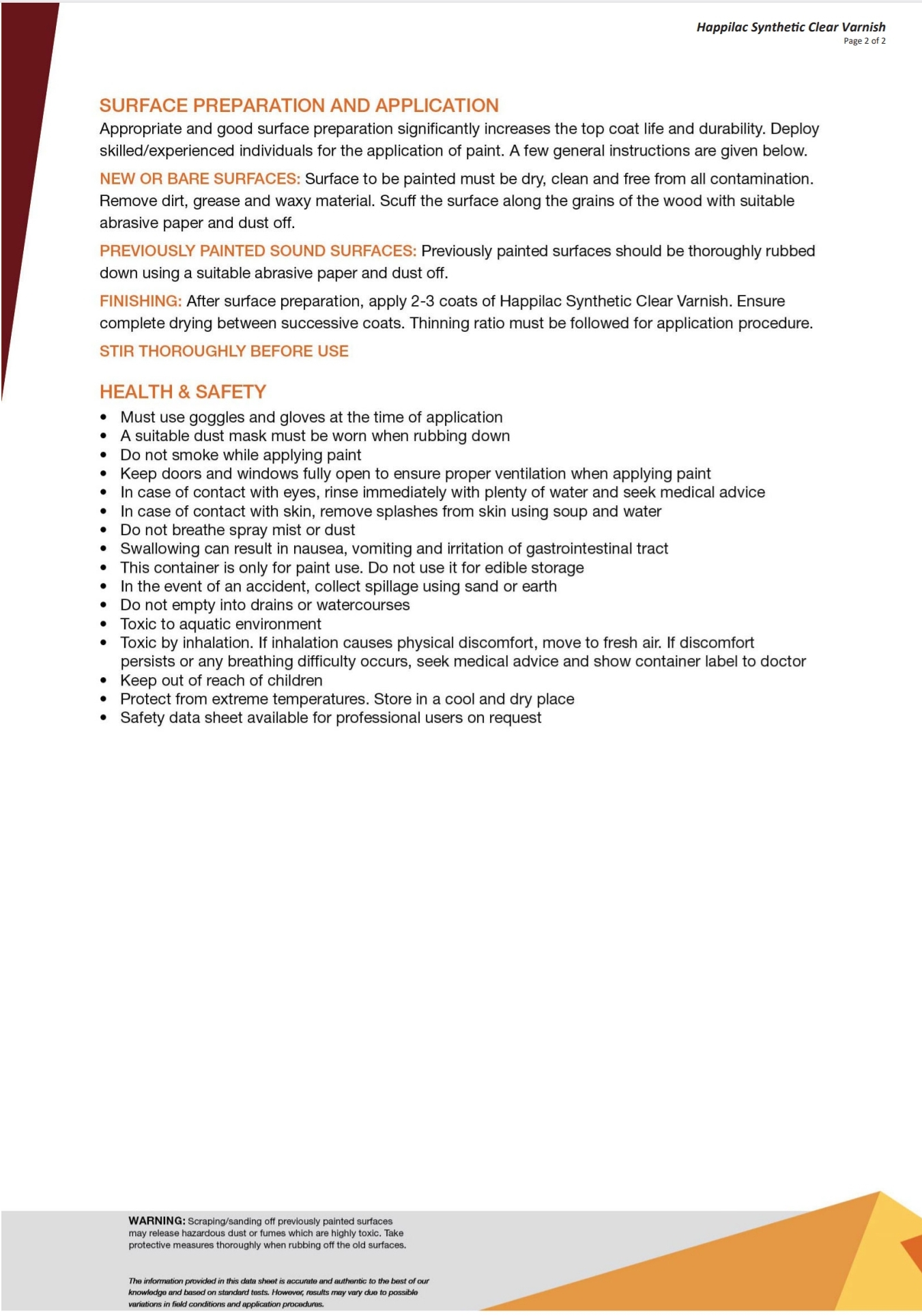 Happilac Synthetic Clear Varnish is an air-drying solvent-based varnish having superb gloss and excellent abrasion resistance. It is used for enhancing the gloss of synthetic enamel. It is based on alkyd resin and high-performance solvent with specialty additives.