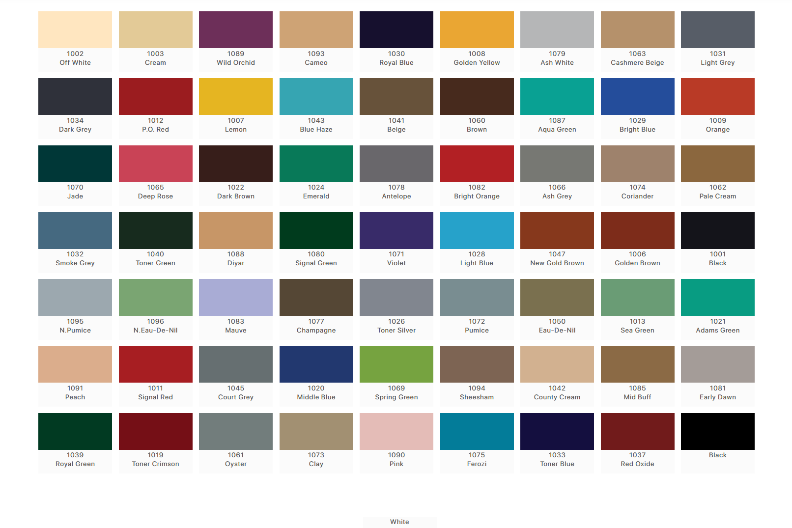 Superior White 1000, Black 1001, Off White 1002, Cream 1003, Golden Brown 1006, Lemon 1007, Golden Yellow 1008, Orange 1009, Signal Red 1011, P.O Red 1012, Sea Grean 1013, Middle Blue 1020, Adams Green 1021, Dark Brown 1022, Emerald 1024, Light Blue 1028, Bright Blue 1029, Royal Blue 1030, Light Grey 1031, Smoke Grey 1032, Dark Grey 1034, Red Oxide 1037, Royal Green 1039, Beige 1041, County Cream 1042, Blue Haze 1043, Court Grey 1045, New Gold Brown 1047, Brown 1060, Oyster 1061, Pale Cream 1062, Cashmere Beige 1063, Deep Rose 1065, Ash Grey 1066, Spring Green 1069, Jade 1070, Violet 1071, Pumice 1072, Clay 1073, Coriander 1074, Ferozi 1075, Champagne 1077, Antelope 1078, Ash White 1079, Signal Green 1080, Early Dawn 1081, Bright Orange 1082, Mauve 1083, Mid Buff 1085, Aqua Green 1087, Diyar 1088, Wild Orchid 1089, Pink 1090, Peach 1091, Cameo 1093, Sheesham 1094, N.Pumice 1095, N.Eau-De-Nill 1096