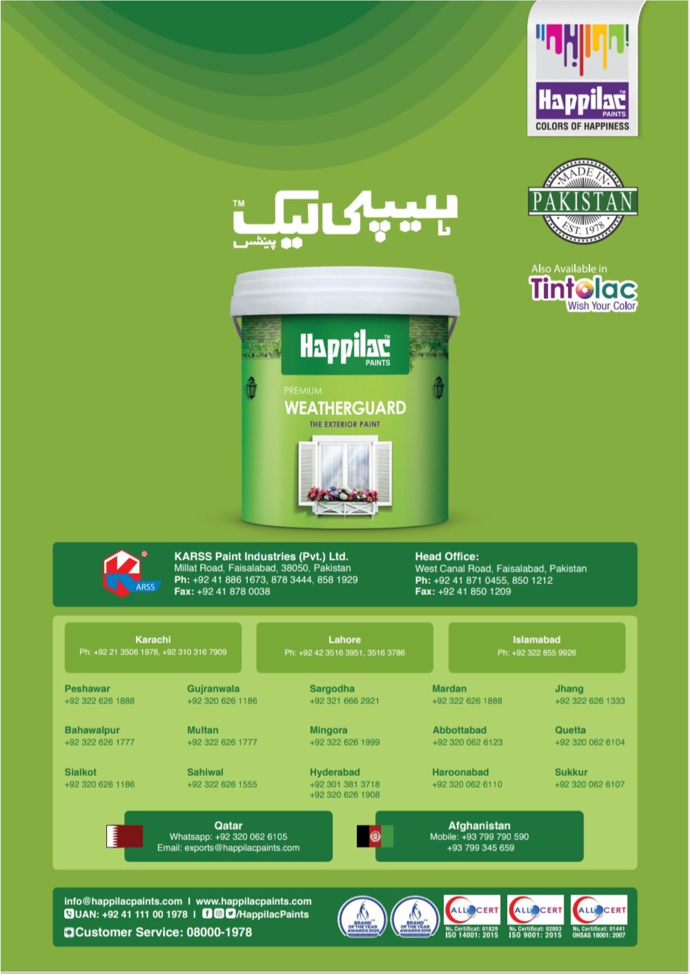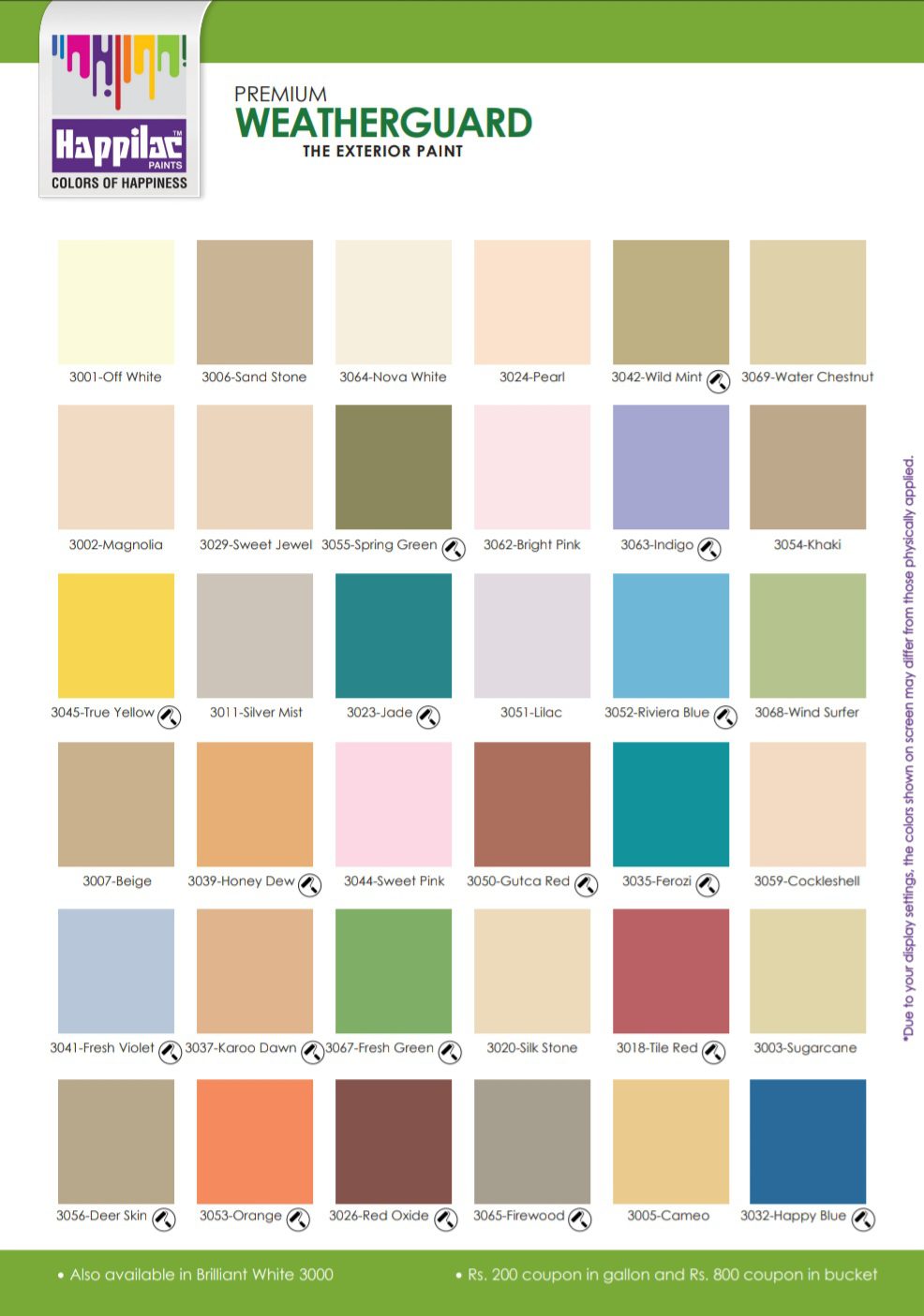 Happilac Weather Guard is an acrylic-based exterior emulsion paint designed to withstand severe weather conditions. It is durable, long-lasting, and possesses high color fastness pigments. Meticulously formulated for protection and decoration of your masonry walls. Available in a wide range of lively colors and appealing aromas to reflect the deepest passion for giving your place a rejuvenating look.